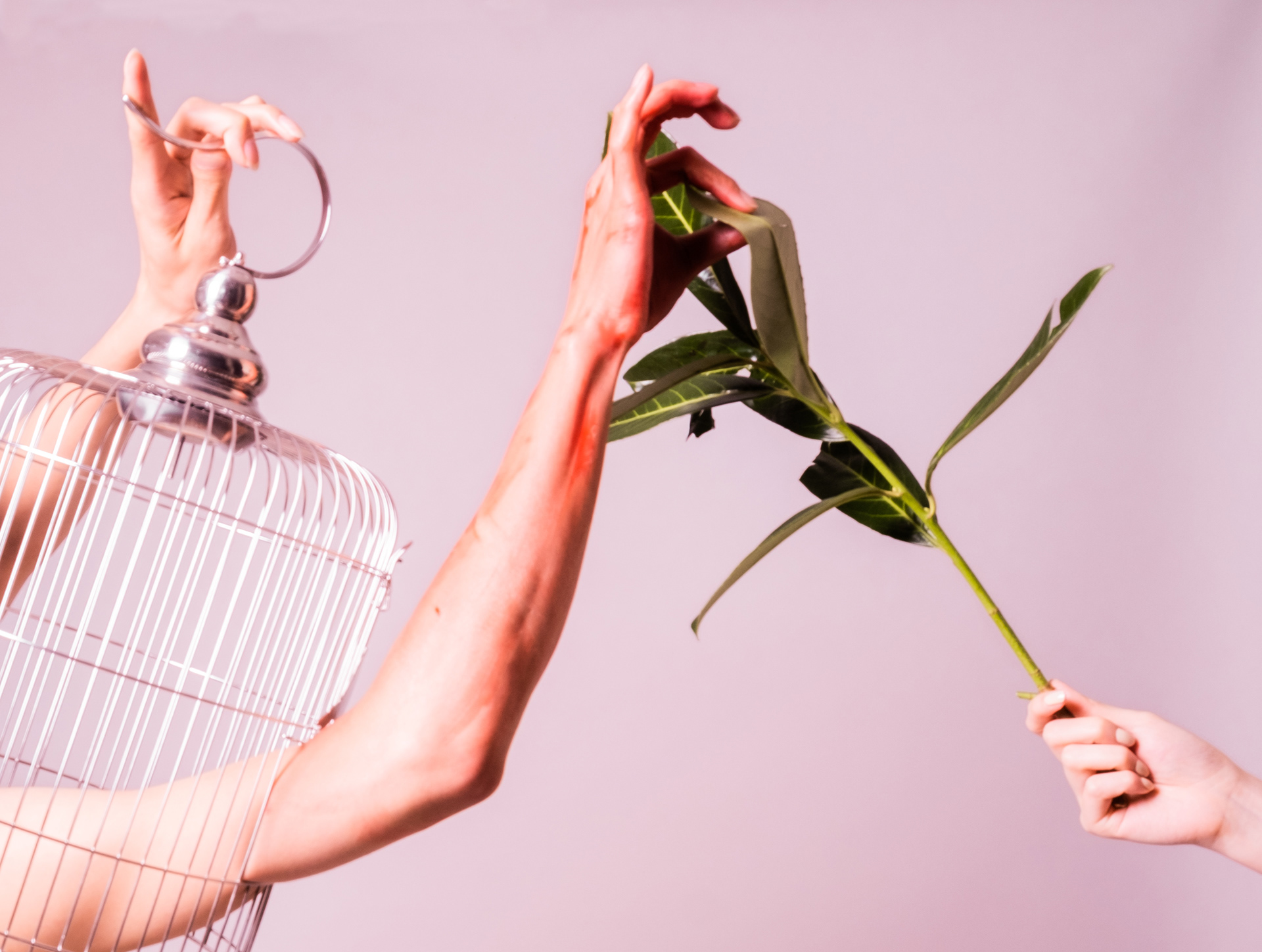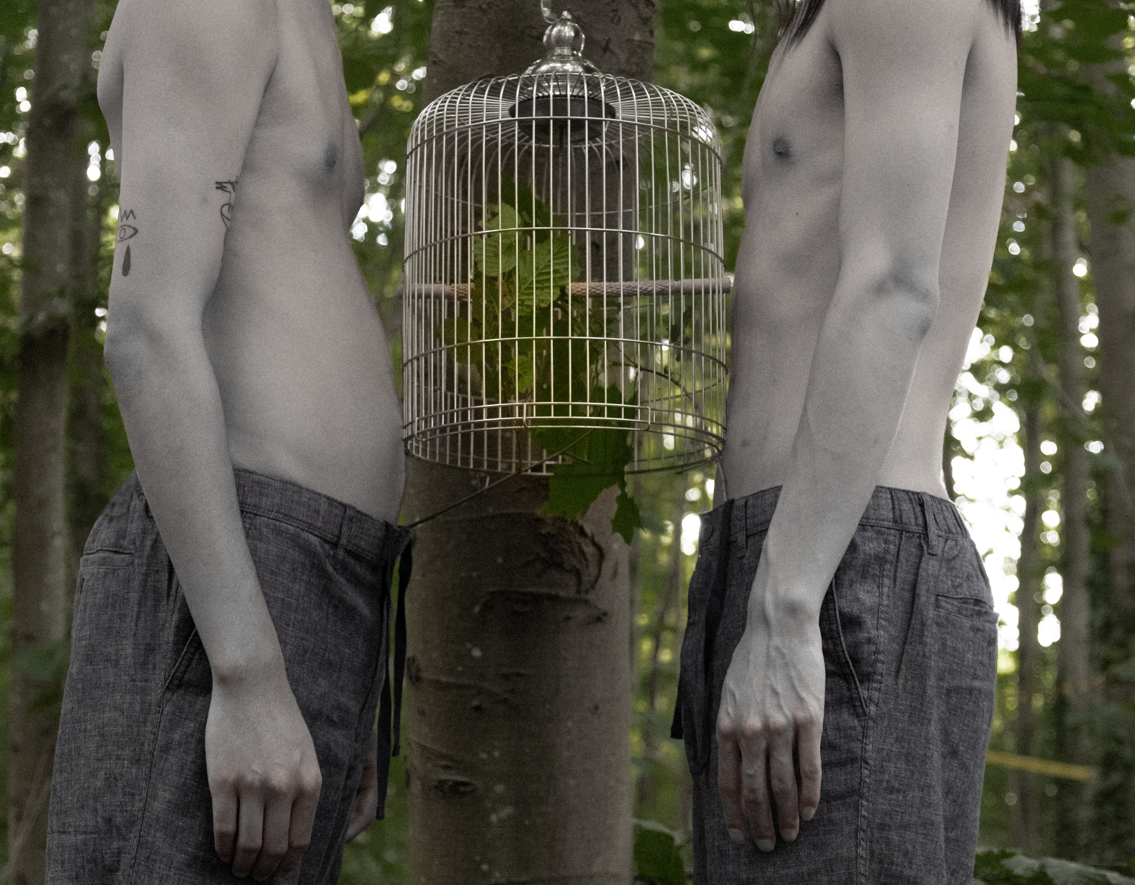 Under the epidemic, we are like birds eating food that is only enough to survive in a small space. We perceive the outside world through a series of codes. While we are paralyzed, we are already mentally wounded. The bond with our partner gives us the opportunity to fly to the jungle, but is the freedom we are struggling for at this moment just a imaginary utopia built up by ourselves, in which sympathy for our suffering flesh has redeemed our souls. Or the mutual comfort of the souls really allows us to be alone in the huge jungle.